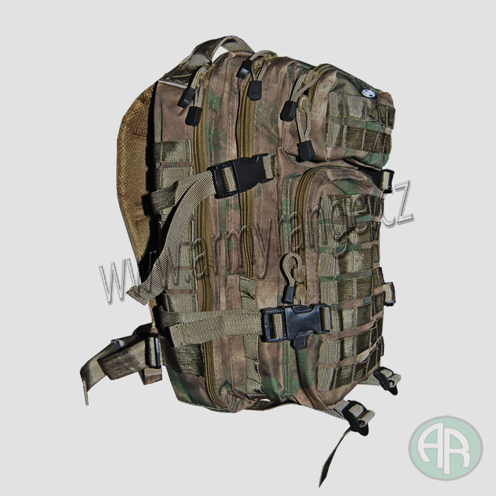 Batoh inspirovaný útočným batohem US Army - ASSAULT PACK. Systém MOLLE - Modular Lightweight Load Carrying Equipment. Batoh vyrobený maskovacím vzoru HDT - camo FG (A-TACS). Camo FG (Camo - FOLIAGE GREEN) moderní typ potisku pro lesní krajinu.