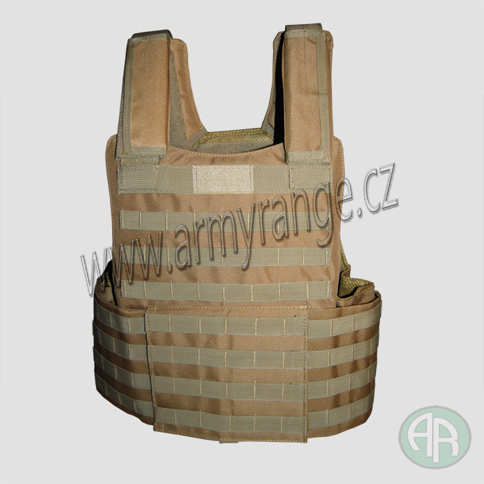 Taktická vesta - nosič plátů. Systém MOLLE - Modular Lightweight Load Carrying Equipment. Velmi pěkné zpracování vesty, vnitřní vrstva je síťovaná. Dovnitř vesty jdou vložit balistické pláty - připravené kapsy na předním a zadním dílu vesty.